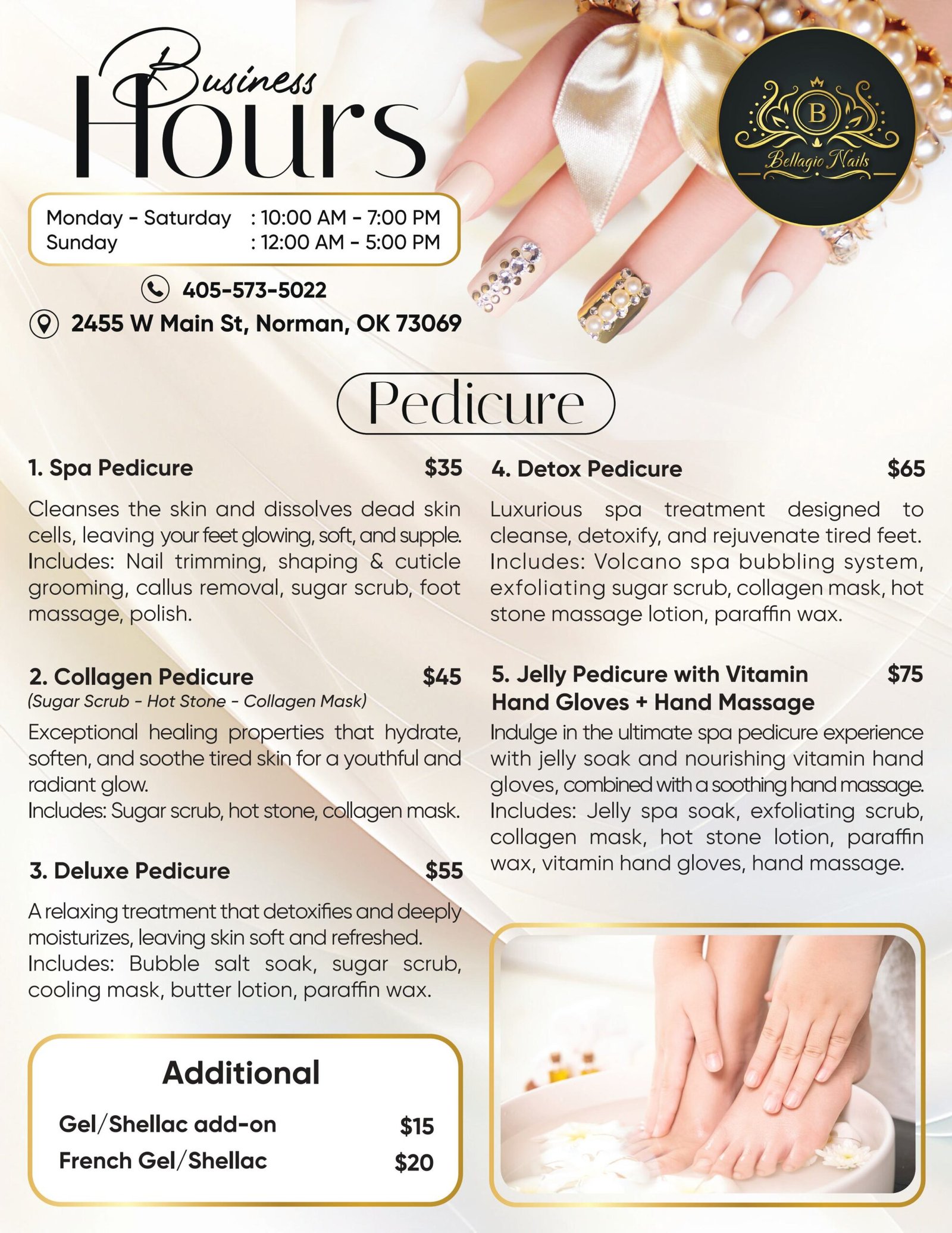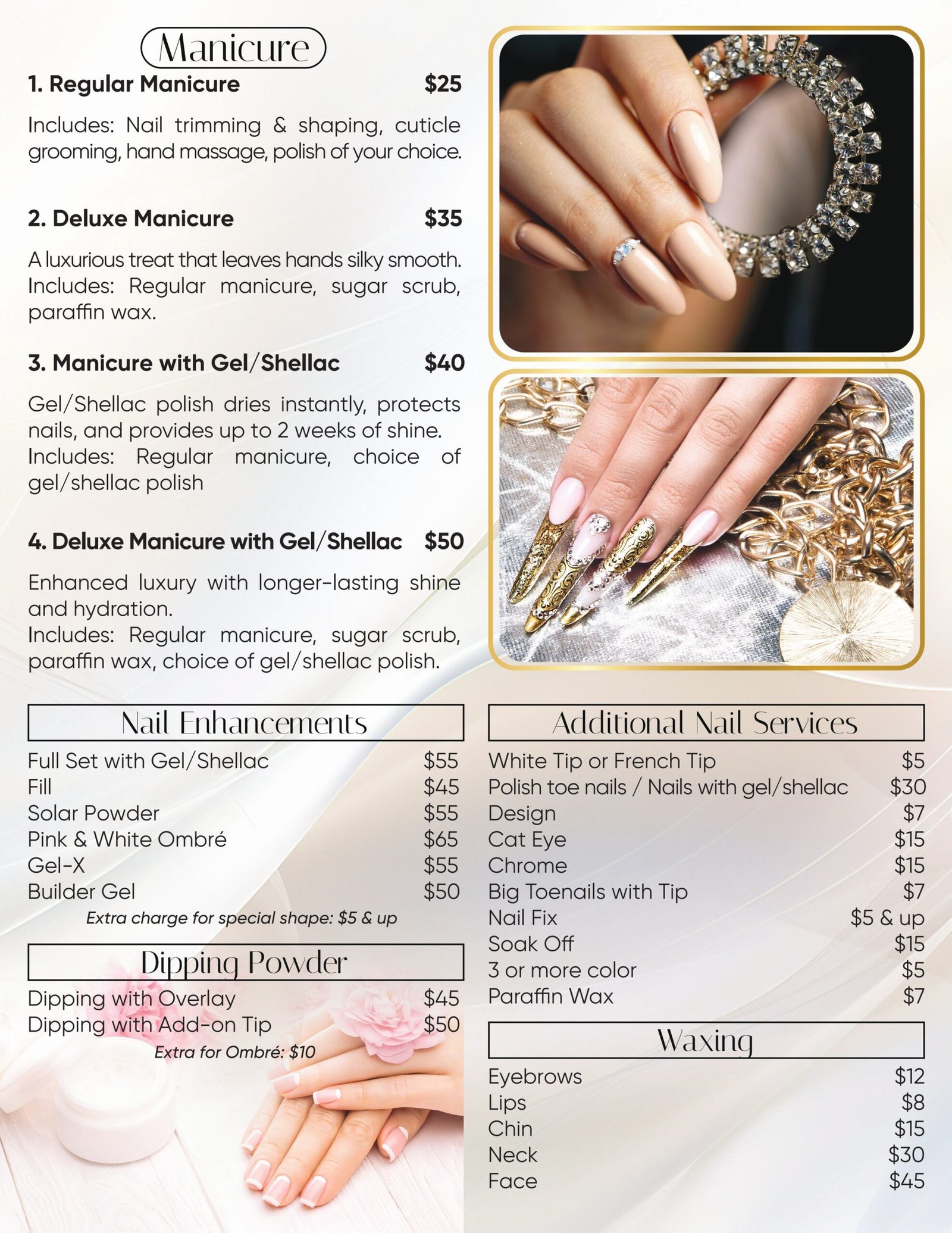Beauty SalonNAIL DESIGN MANICURE$18DELUXE MANICURE$25GEL MANICURE$35PRINCESS MANICURE$12BROW APPLICATION$12PEDICURE$38 GEL PEDICURE$52PRINCESS PEDICURE$20FULL SET$32FILL$22 Beauty SalonMAKEUP MANICURE$18DELUXE MANICURE$25GEL MANICURE$35PRINCESS MANICURE$12BROW APPLICATION$12PEDICURE$38 GEL PEDICURE$52PRINCESS PEDICURE$20FULL SET$32FILL$22 Beauty SalonTATTOO MANICURE$18DELUXE MANICURE$25GEL MANICURE$35PRINCESS MANICURE$12BROW APPLICATION$12PEDICURE$38 GEL PEDICURE$52PRINCESS PEDICURE$20FULL SET$32FILL$22